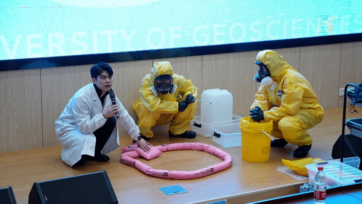 在应急演练环节,曹志伟以实验室一处浓酸泄漏为例,指导学生从事故的发现与报告、前期的紧急疏散与警戒隔离,到中期的专业应急处置与人员救护,再到后期的泄漏物清理与现场恢复。整个流程衔接紧密,响应迅速,处置专业,并在此过程中逐一讲述处置危化品的各项注意事项和防护用品的使用方法。