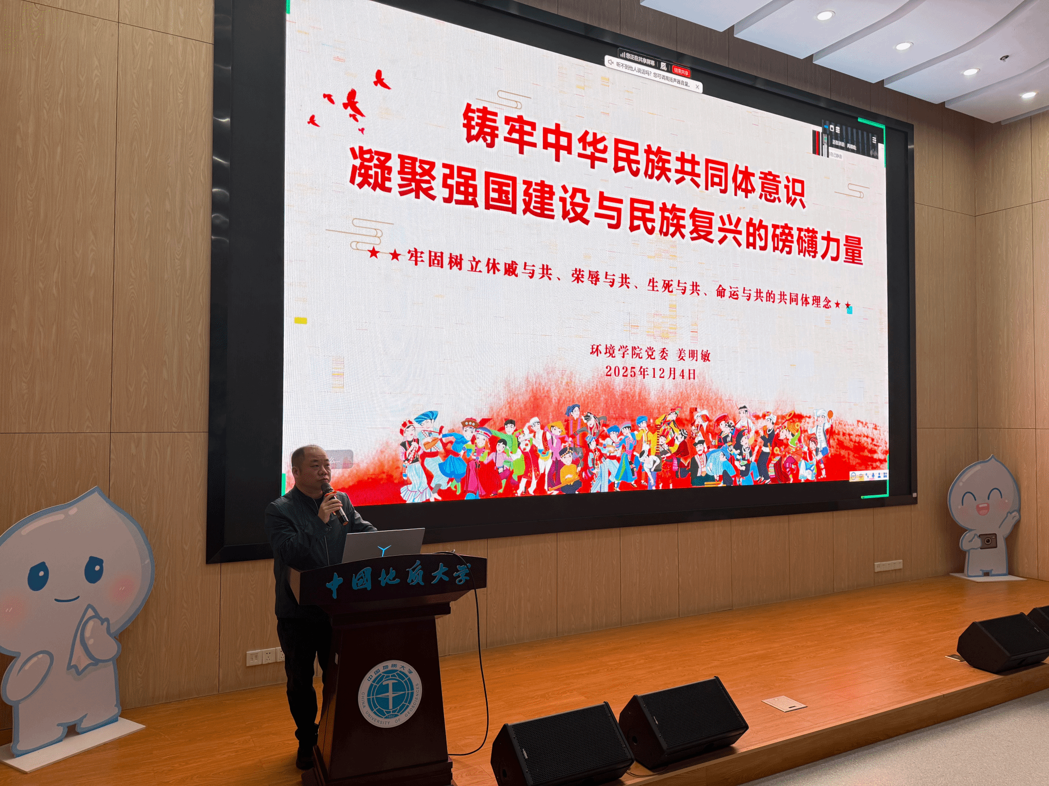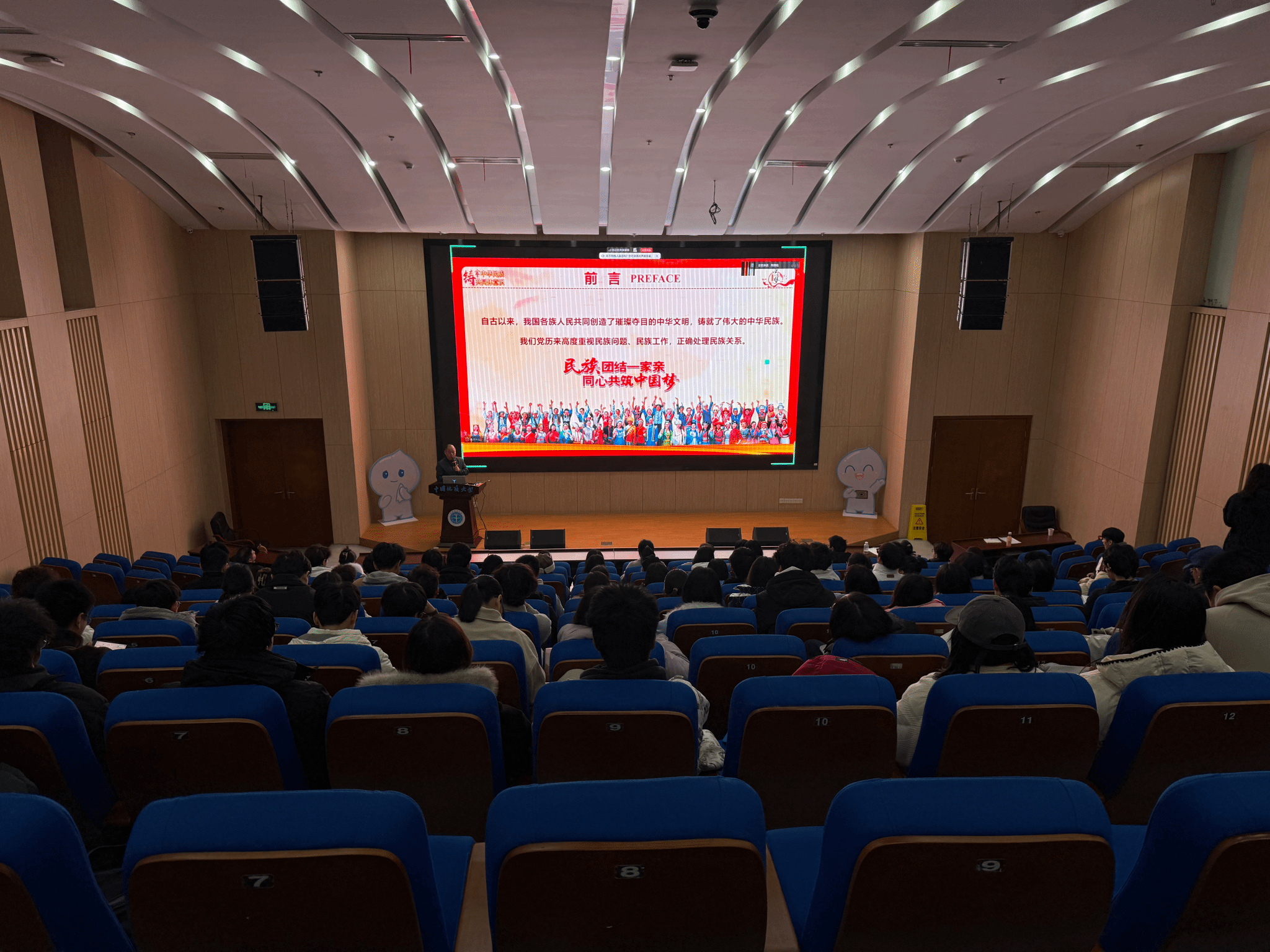姜明敏围绕“铸牢中华民族共同体意识,凝聚强国建设与民族复兴的磅礴力量”主题展开讲授。他介绍,党的十八大以来,以习近平同志为核心的党中央把铸牢中华民族共同体意识作为新时代党的民族工作的主线、作为民族地区各项工作的主线,为推进中国式现代化凝聚起民族团结的磅礴力量。他带领大家回顾铸牢中华民族共同体意识的提出与发展,勉励大家要充分认清铸牢中华民族共同体意识的重大意义、准确领会铸牢中华民族共同体意识的丰富内涵,从而牢牢把握铸牢中华民族共同体意识的实践途径。最后,他分享了学校和学院在铸牢中华民族共同体意识方面的实践成果,通过开展多元的文化交流活动,促进各少数民族学子在校园中实现文化互通、成果共享,共同营造团结和谐文化氛围。