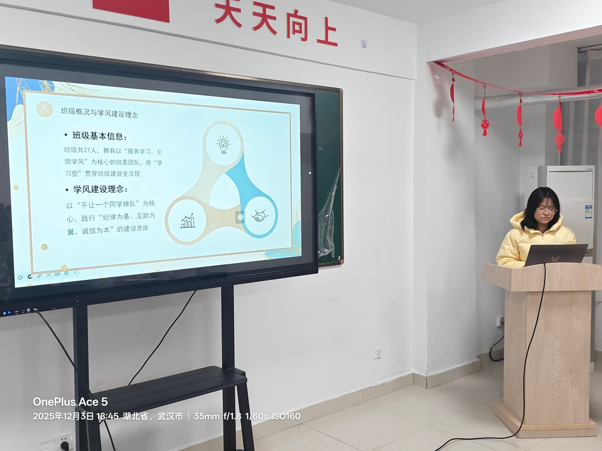 随后,学风示范班级评选答辩会正式展开。各班学习委员围绕10月至11月班级学风建设实践依次登台答辩,全面展示建设举措与显著成效。汇报内容各具特色,部分班级紧扣“考勤数据+学习成效”,详实阐述课前提醒与课后复盘相结合的管理制度;部分班级重点展示“小组互助学习”及学习资源共享模式,以鲜活案例印证同学间互补短板、共同提升的实效;也有班级介绍了“知识点答疑会”“期末备考分享会”“小老师朋辈课堂”等特色活动的组织与成果。与会人员结合汇报内容,就学风管理细节优化、活动落地实效等关键点,与各班学委展开深入交流与探讨,进一步明晰了班级学风建设的方向。