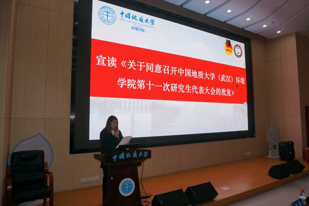 校研究生会主席团成员陈薇宣读《关于同意召开中国地质大学(武汉)bv伟德国际1946第十一次研究生代表大会的批复》。