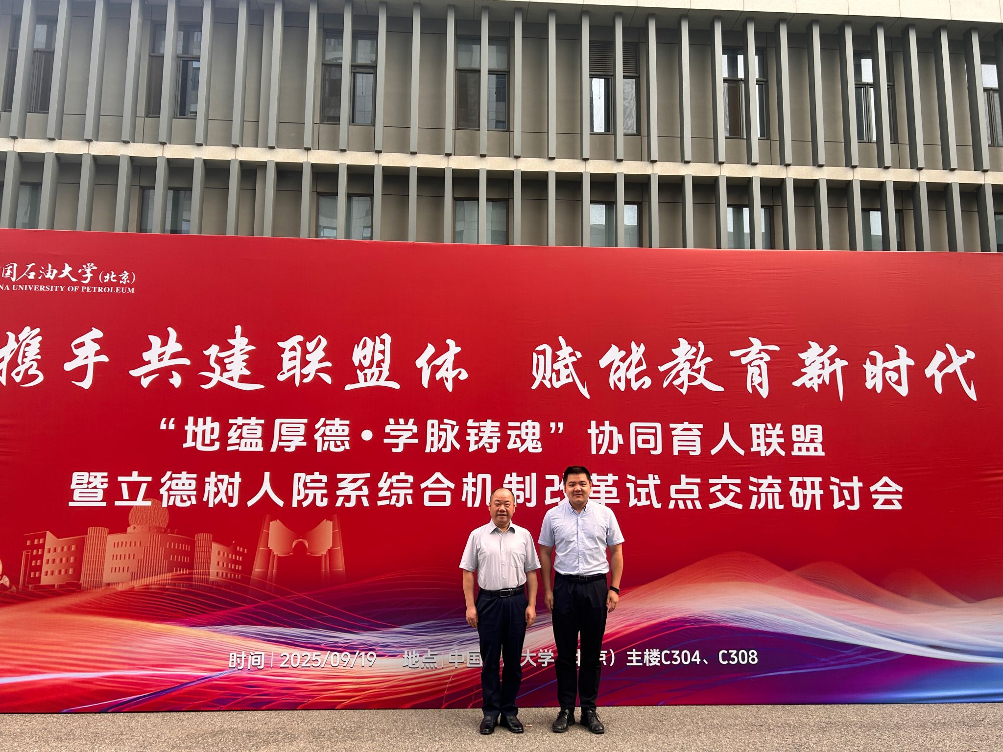 (通讯员陈俊男 摄影中国石油大学(北京) 编辑申墁烨)为深入学习贯彻全国教育大会精神和《教育强国建设规划纲要(2024—2035年)》,推进新时代立德树人工程重点任务落地见效,9月19日,“地蕴厚德·学脉铸魂”协同育人联盟成立仪式暨立德树人院系综合机制改革试点交流研讨会在中国石油大学(北京)举行,学院受邀参加并联合发起成立“地蕴厚德·学脉铸魂”协同育人联盟。学院党委书记姜明敏,辅导员陈俊男参加本次研讨会。